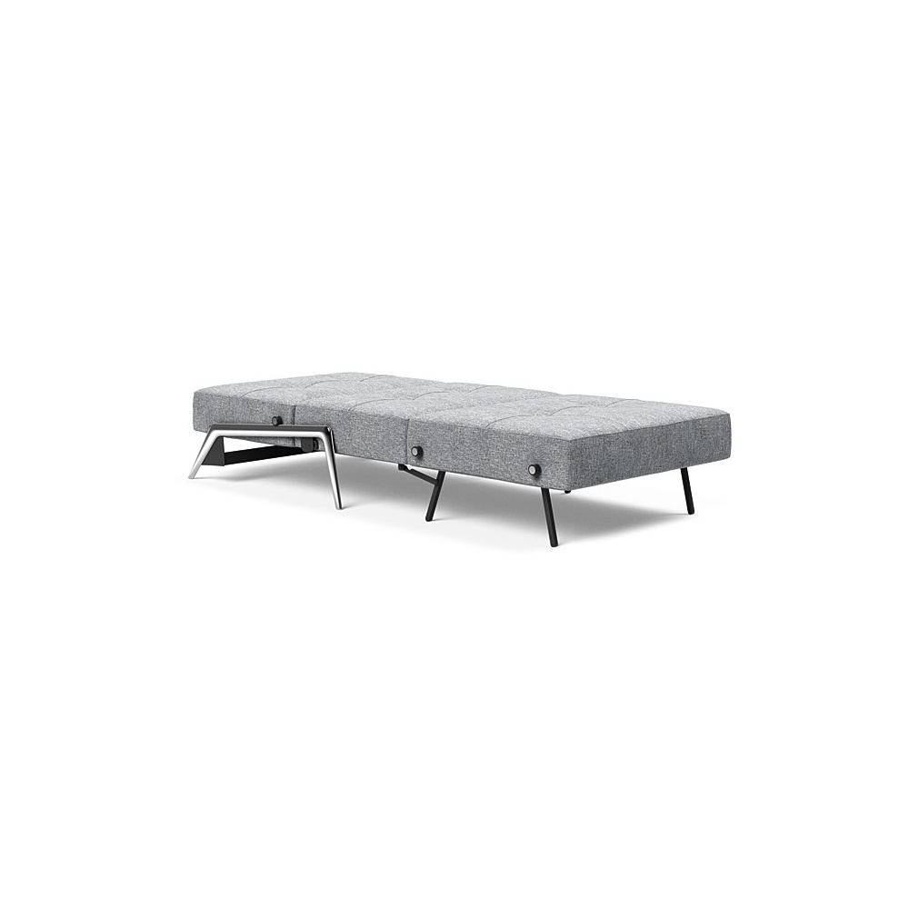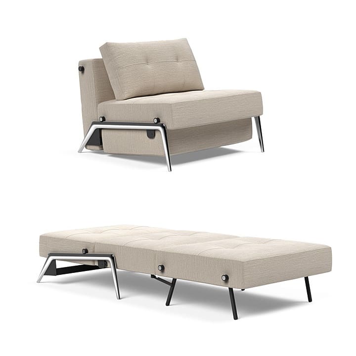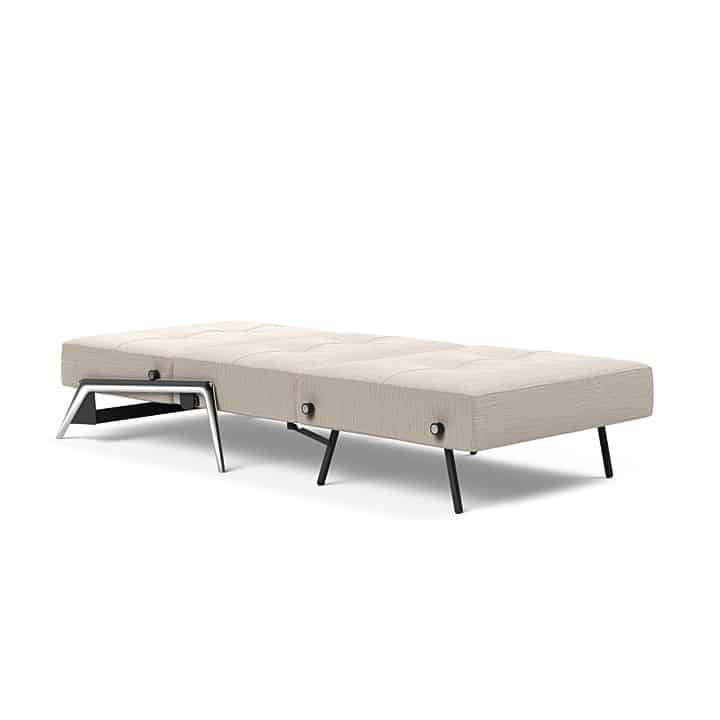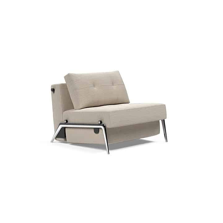 Cubed 90 med med alu ben en riktigt smidig bäddfåtölj där benen fälls ut automatiskt när du fäller ut soffan. Det finns plats för förvaring i soffan. Soffan finns i fyra standard tyger.