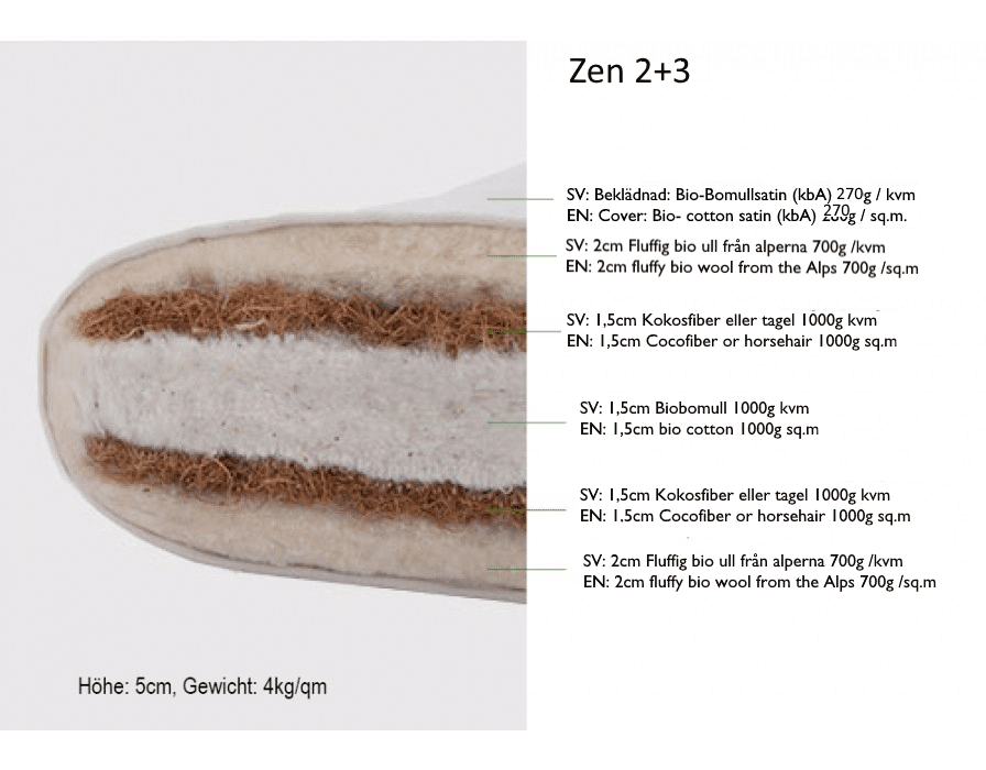 SV Zen R2+4 100 x200cm Outlet en tunn futonmadrass med flera lager bomull på varje sida av en kärna av tunn kokosfier.